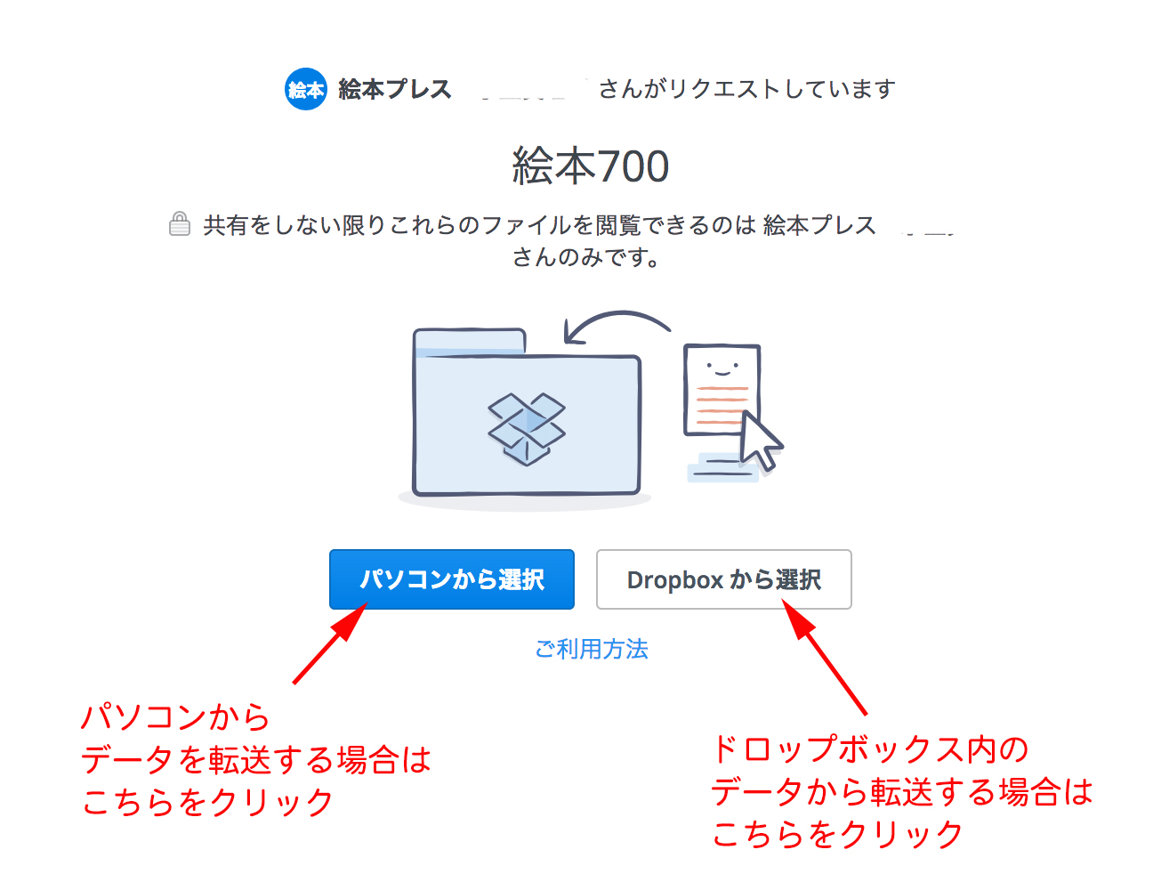 ・エラー:[絵本プレス]さんの Dropbox にはこれらのファイルに必要な容量がありません。と表示される場合は、データ転送サービス経由で入稿お願いします。